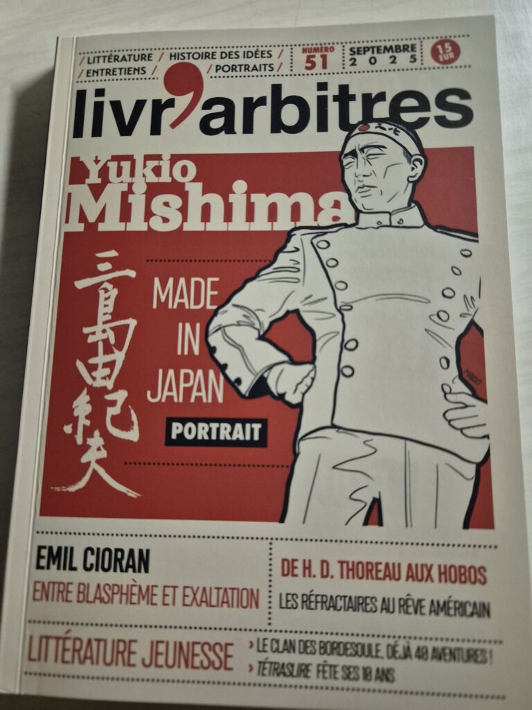 Encore ne t’ai-je pas parlé du dernier numéro de Livr’arbitres (n°51) dont la couverture et le dossier central sont consacrés à Mishima. Je ne raffole ni de Mishima aux mœurs … spéciales, ni du Japon, plus généralement, dont Raspail a tout dit dans son génial et si drôle roman : « Bienvenue honorables visiteurs ». Mais Mishima, c’est aussi « Le soleil et l’acier », les arts martiaux, et c’est surtout sa vie, qu’il a mise en scène de bout en bout. Un personnage « made in Japan » comme l’écrit Livr’arbitres.