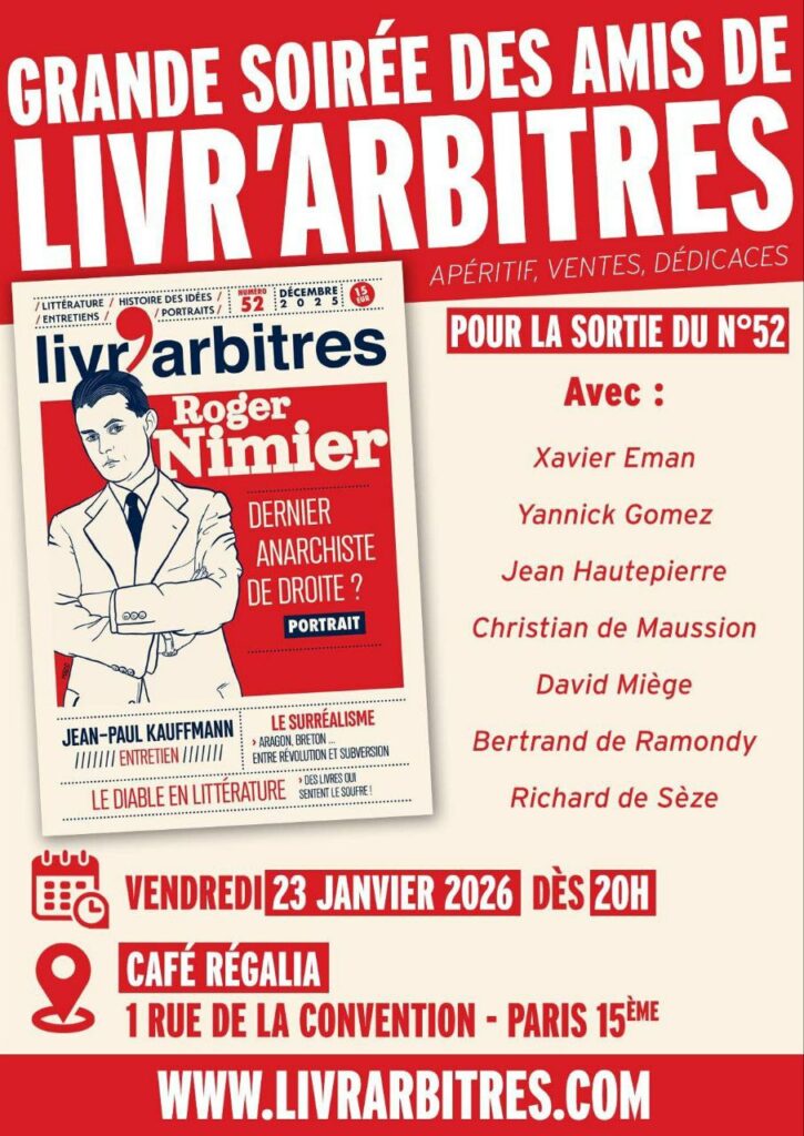 A l’occasion de la sortie du nouveau numéro consacré notamment à la figure de Roger Nimier, la revue littéraire non-conforme Livr’arbitres organise sa traditionnelle soirée vente-dédicaces-apéritif ce vendredi 23 janvier, à partir de 20 heures, au café Régalia, 1, rue de la Convention, 75015 Paris.