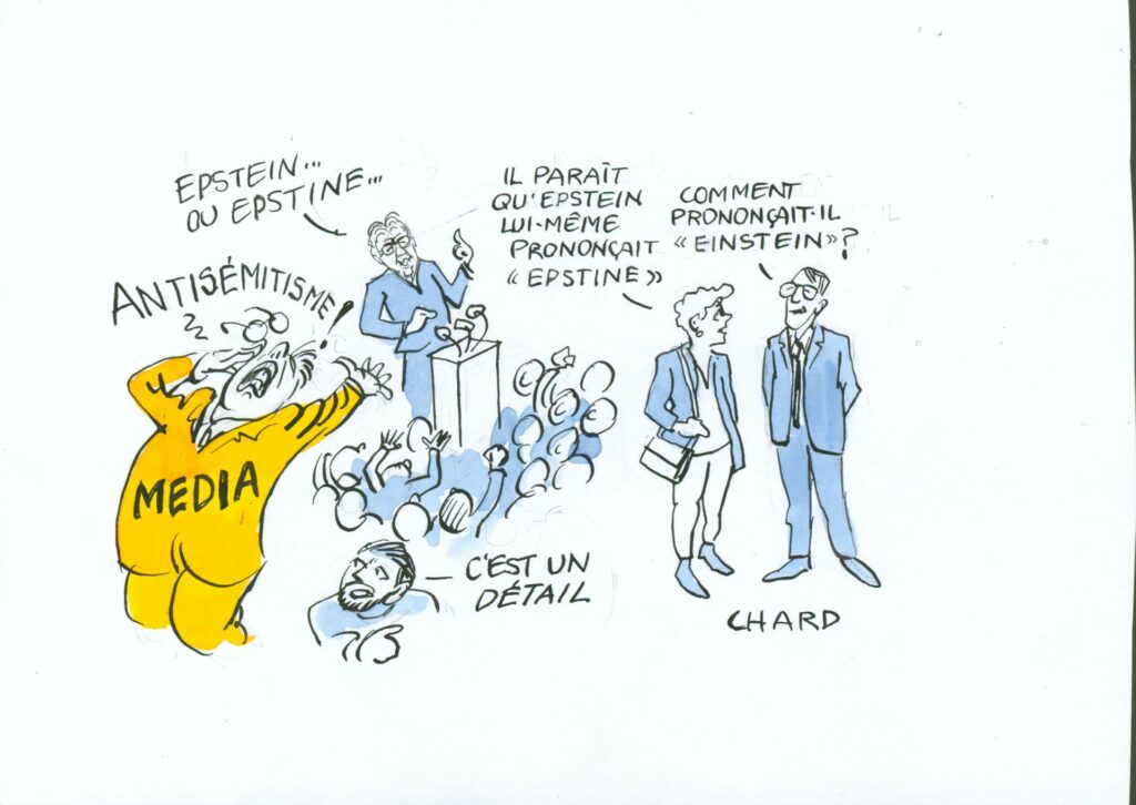 Accusations d’antisémitisme visant Jean-Luc Mélenchon: le dessin de Chard Articles Politique5 mars 20265 mars 2026 la Rédaction Aucun commentaire Le chef de la France Insoumise multiplie les provocations suscitant l’ire des médias et du « bloc central » mais resserrant les rangs de l’extrême-gauche autour de son « lider maximo » attaqué par le « système ». Abonnez vous à notre lettre d’information Partager c'est militerTwitterFacebookLinkedInTelegramWhatsApp Étiquettesantisémitismeextrême gaucheMédiasMélenchon