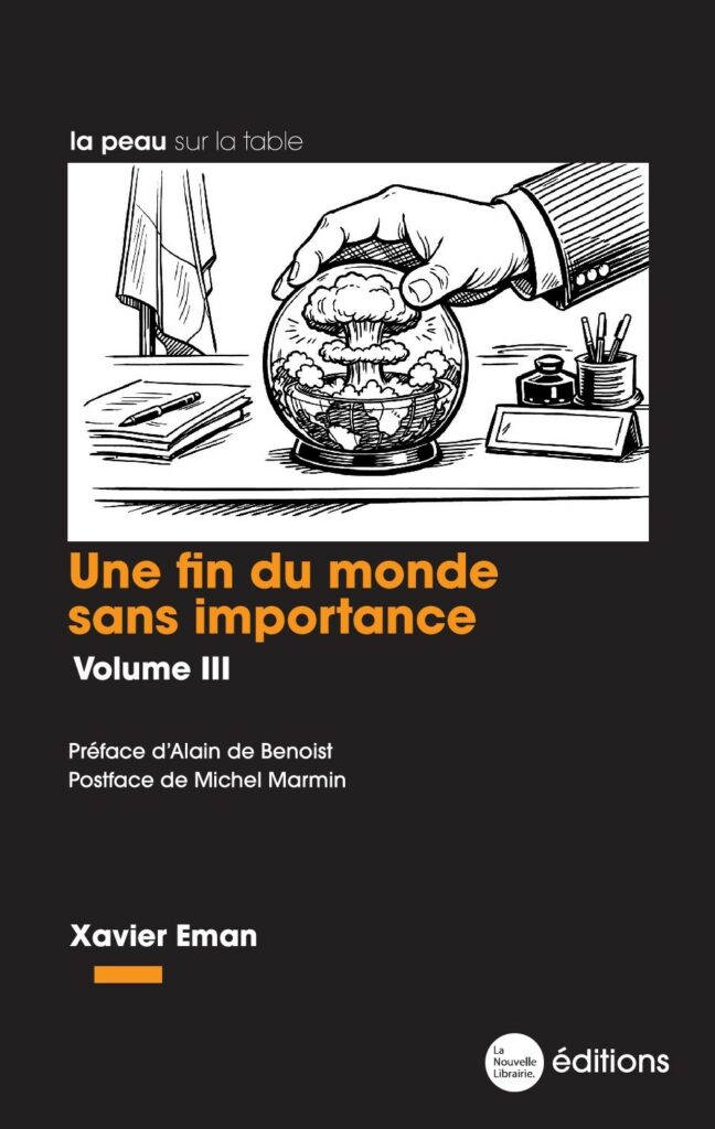 Notre rédacteur en chef, Xavier Eman, publie, aux éditions de la Nouvelle Librairie, le troisième volume de ses « Chroniques d’une fin du monde sans importance », publiées tous les deux mois dans la revue Eléments. Une série de courts textes, « choses vues » de notre quotidien, qui raconte le monde tel qu’il ne va pas et illustre les déboires d’une humanité qui semble de plus en plus résignée. C’est drôle, parfois cruel, toujours percutant.