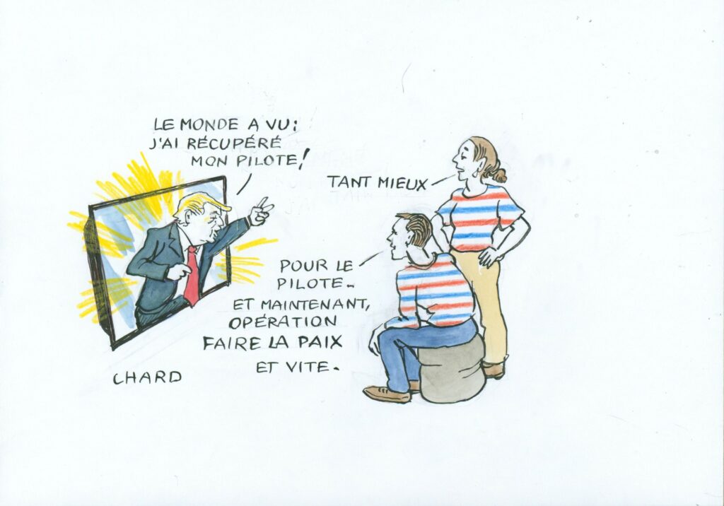 Guerre en Iran: le dessin de Chard Articles International6 avril 20266 avril 2026 la Rédaction Aucun commentaire Le sauvetage du pilote américain abattu par les forces iraniennes va-t-il calmer les ardeurs destructrices et vengeresses du président américain? Le monde ne peut que l’espérer. Abonnez vous à notre lettre d’information Partager c'est militerTwitterFacebookLinkedInTelegramWhatsApp ÉtiquettesGuerreIranTrump