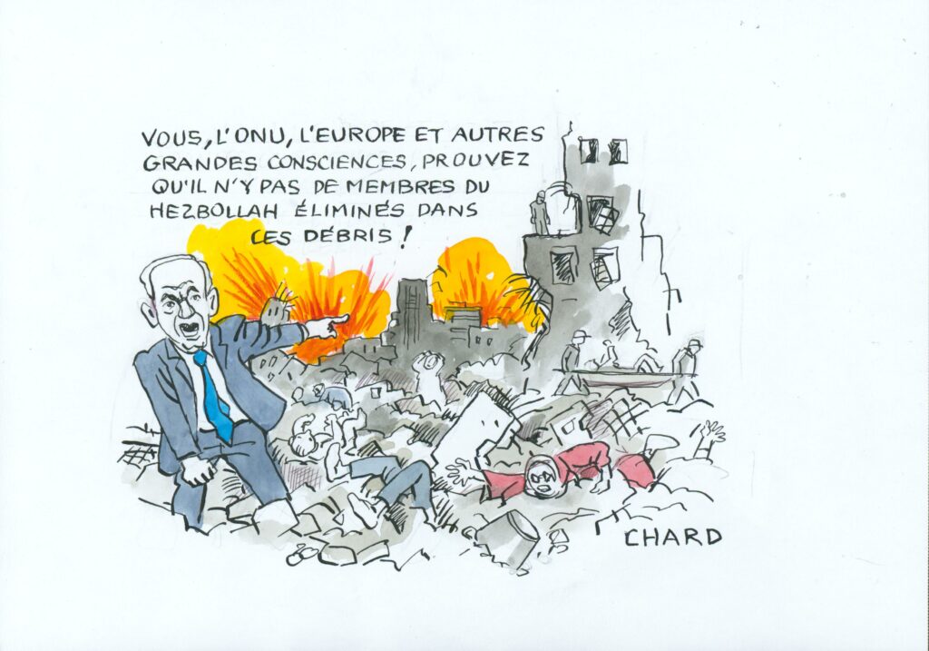 Proche-Orient martyr: le dessin de Chard Articles International13 avril 202613 avril 2026 la Rédaction Aucun commentaire Missiles et bombes israéliennes continuent à pleuvoir sur l’Iran et le Liban. Les populations civiles, comme toujours, en sont les principales victimes. Abonnez vous à notre lettre d’information Partager c'est militerTwitterFacebookLinkedInTelegramWhatsApp ÉtiquettesbombardementsIsraëllibran