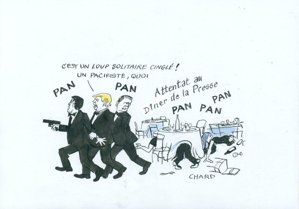 Pour la première fois, sous sa première comme sous sa seconde présidence, que Donald Trump consentait à assister le 24 avril à l’hôtel Hilton de Washington au gala annuel des correspondants de presse (qui lui sont pour la plupart hostiles) accrédités auprès de la Maison-Blanche, il a été servi. A peine les participants avaient-ils applaudi le discours de bienvenue que des coups de feu retentissaient, obligeant le service d’ordre à évacuer le couple présidentiel et les invités en tenue de soirée à se précipiter sous les tables.